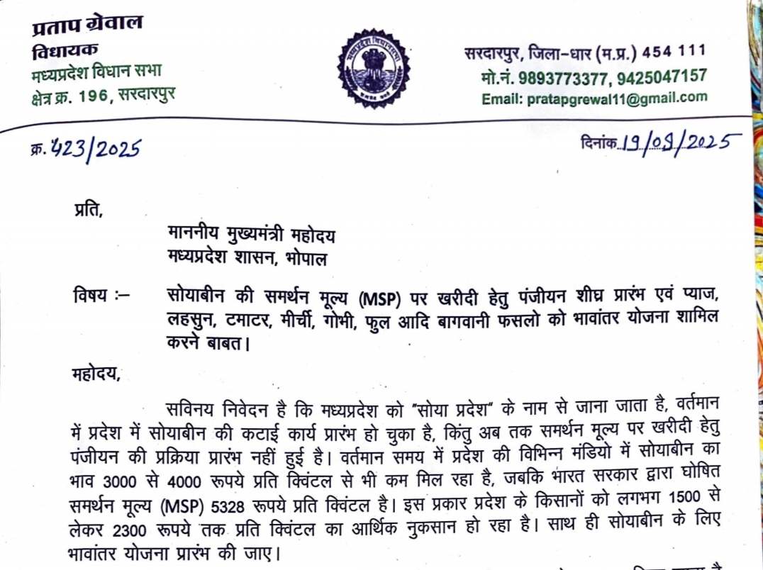 सरदारपुर – समर्थन मूल्य पर सोयाबीन खरीदी हेतु पंजीयन प्रारंभ करने हेतु विधायक ग्रेवाल ने CM को लिखा पत्र, कहा- समर्थन मूल्य से भी कम दाम पर बिक रहा सोयाबीन September 19, 2025