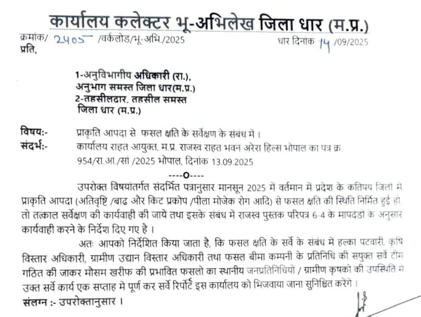 ब्लॉक कांग्रेस अध्यक्ष ने बताया कि कांग्रेस पार्टी द्वारा दिए गए ज्ञापन पर त्वरित कार्यवाही करते हुए जिला प्रशासन द्वारा रविवार को सरदारपुर राजस्व क्षेत्र सहित संपूर्ण धार जिले में पीला मोजेक वायरस, अतिवृष्टि, कीट प्रकोप से नष्ट सोयाबीन एवं अन्य फसलों के सर्वे करने के आदेश जारी किए गए है सर्वे दल में हल्का पटवारी, कृषि विस्तार अधिकारी, ग्रामीण उद्यान विस्तार अधिकारी, फसल बीमा कंपनी के प्रतिनिधि को शामिल किया गया है एवं स्थानीय जनप्रतिनिधियों, कृषकों की उपस्थिति में नष्ट फसलों का सर्वे कर एक सप्ताह में रिपोर्ट प्रस्तुत करने के निर्देश दिए गए है।